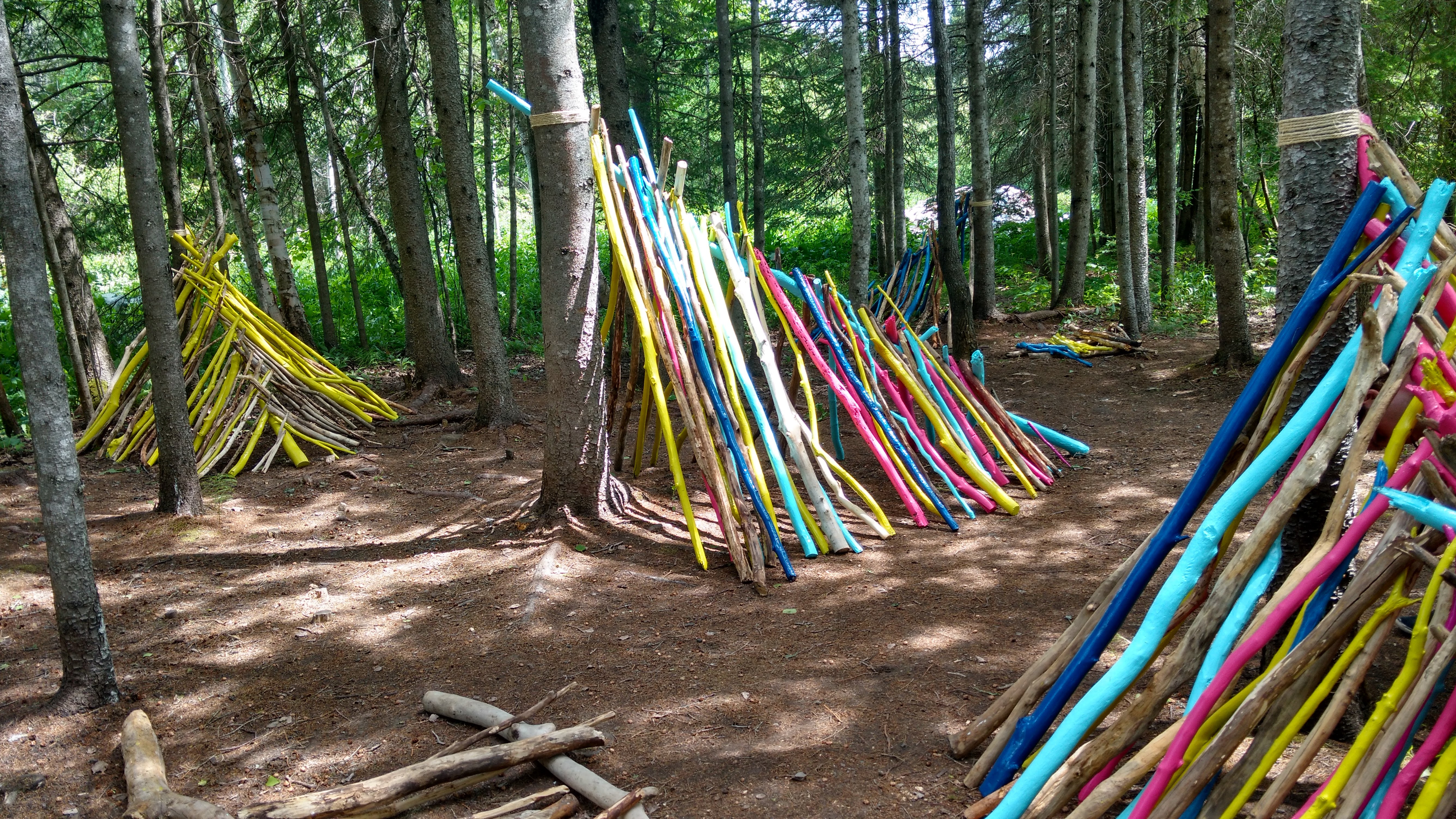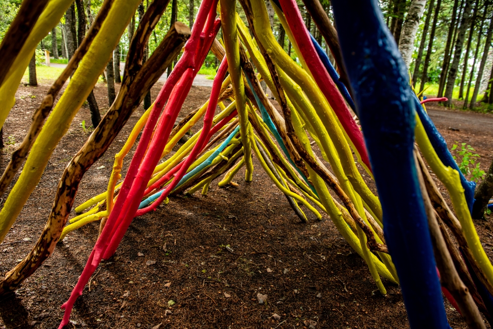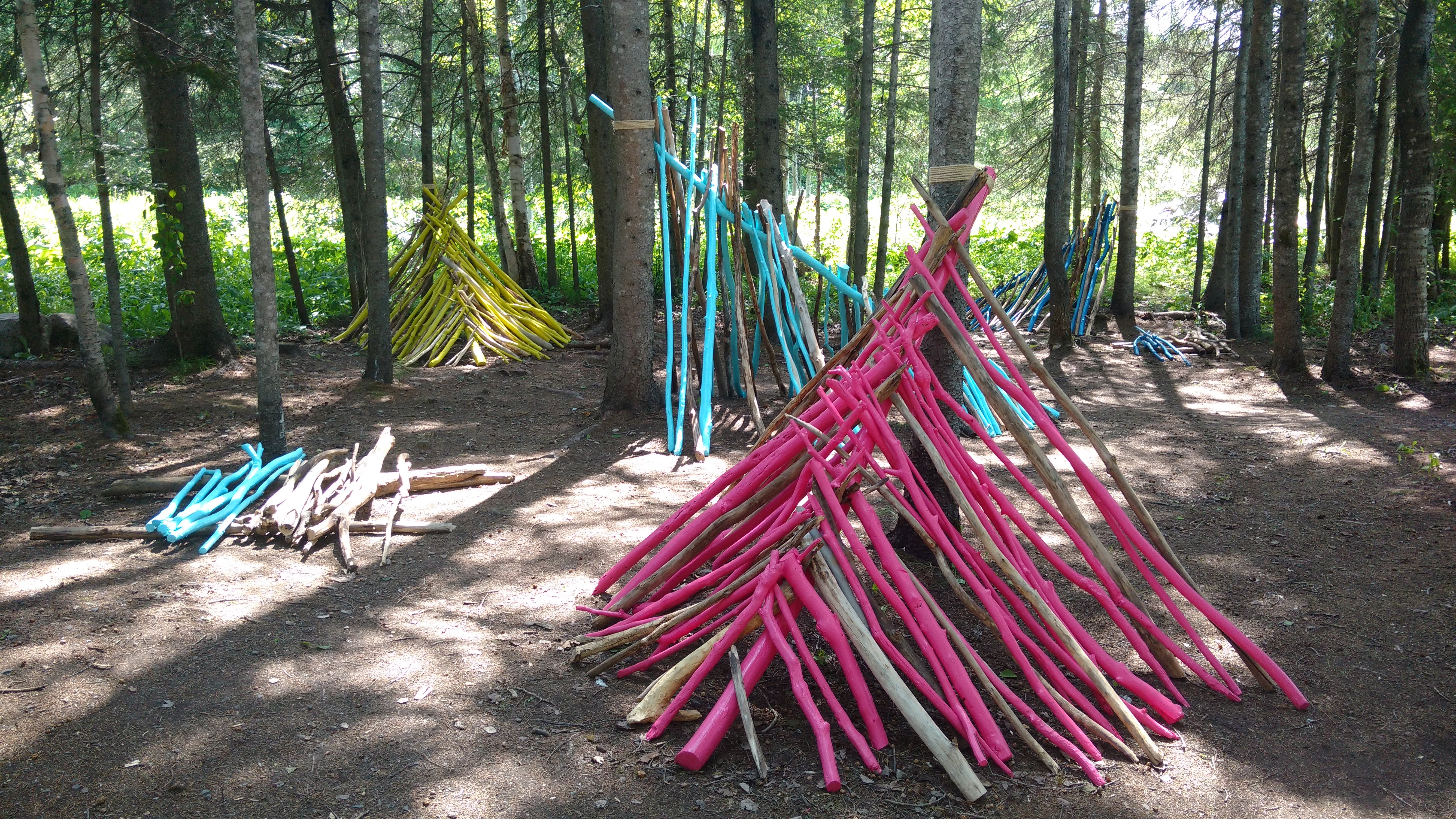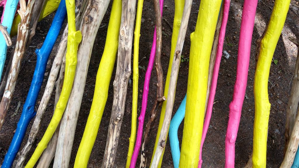 The colours of the individual branches and sticks stand out among the forest, the organic shapes contrasting with the luminous colours of the paint. Each branch became an object in itself, beautiful for its natural form; together, these pieces created an organic and abstract structure that is both inviting, familiar and striking within the landscape.