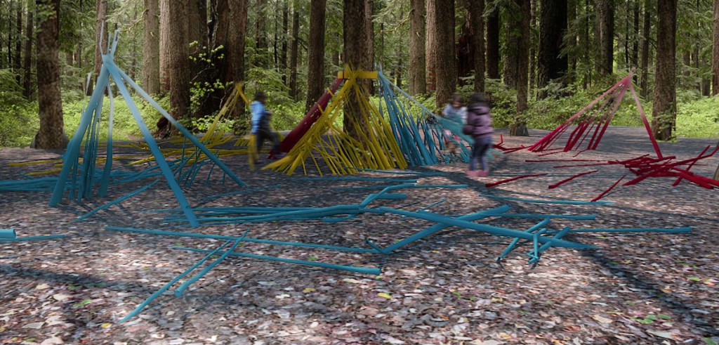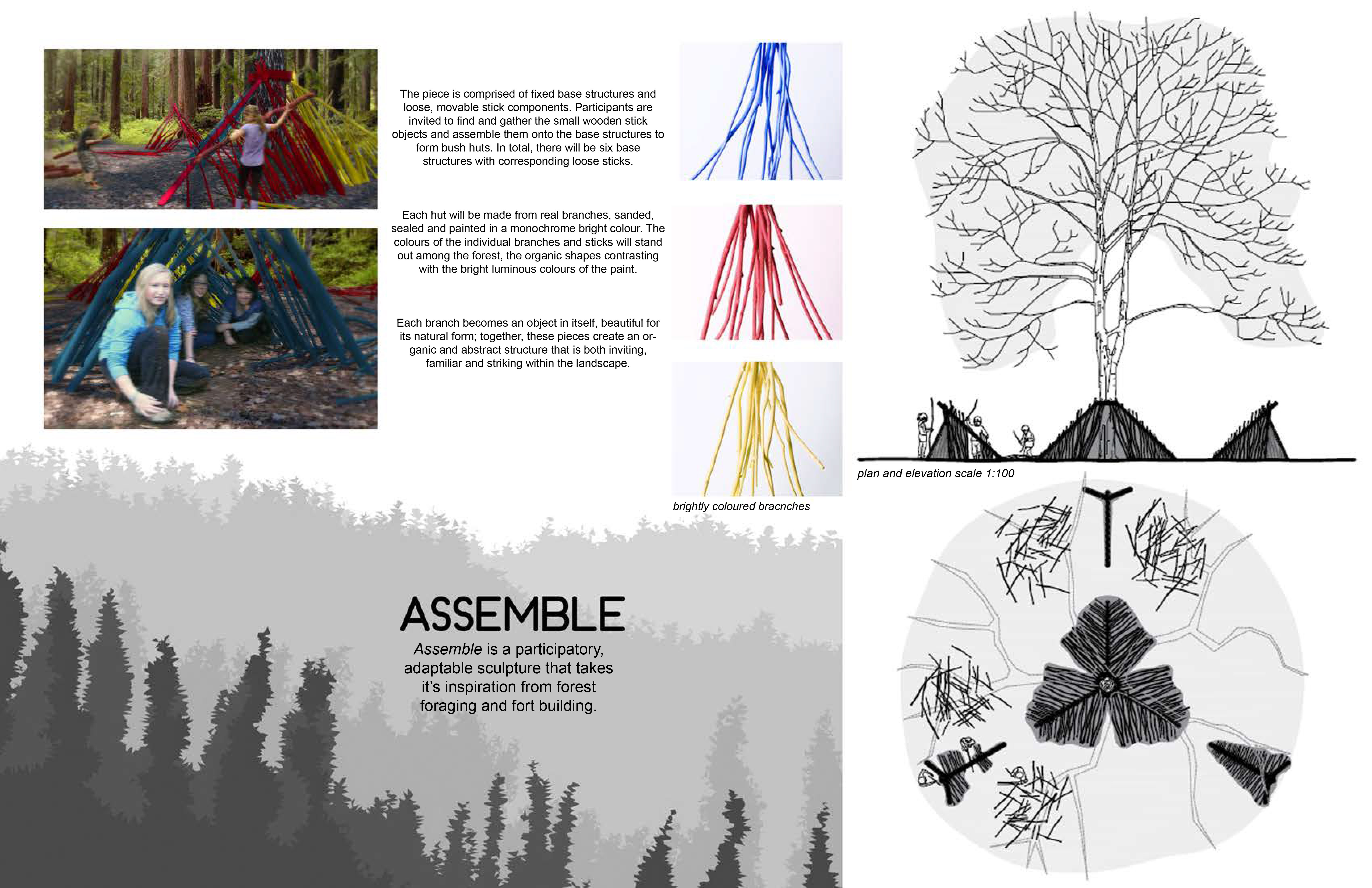The piece was comprised of fixed structural frames and free components, made from found branches which were sanded, sealed and painted. Participants were invited to find and gather the wooden parts and assemble them onto the base structures to form huts inspired by the survival shelter typologies taught in outdoor education classes. Each of the shelters can be assembled in a single bright colour, or reorganized to suit the play of participants.